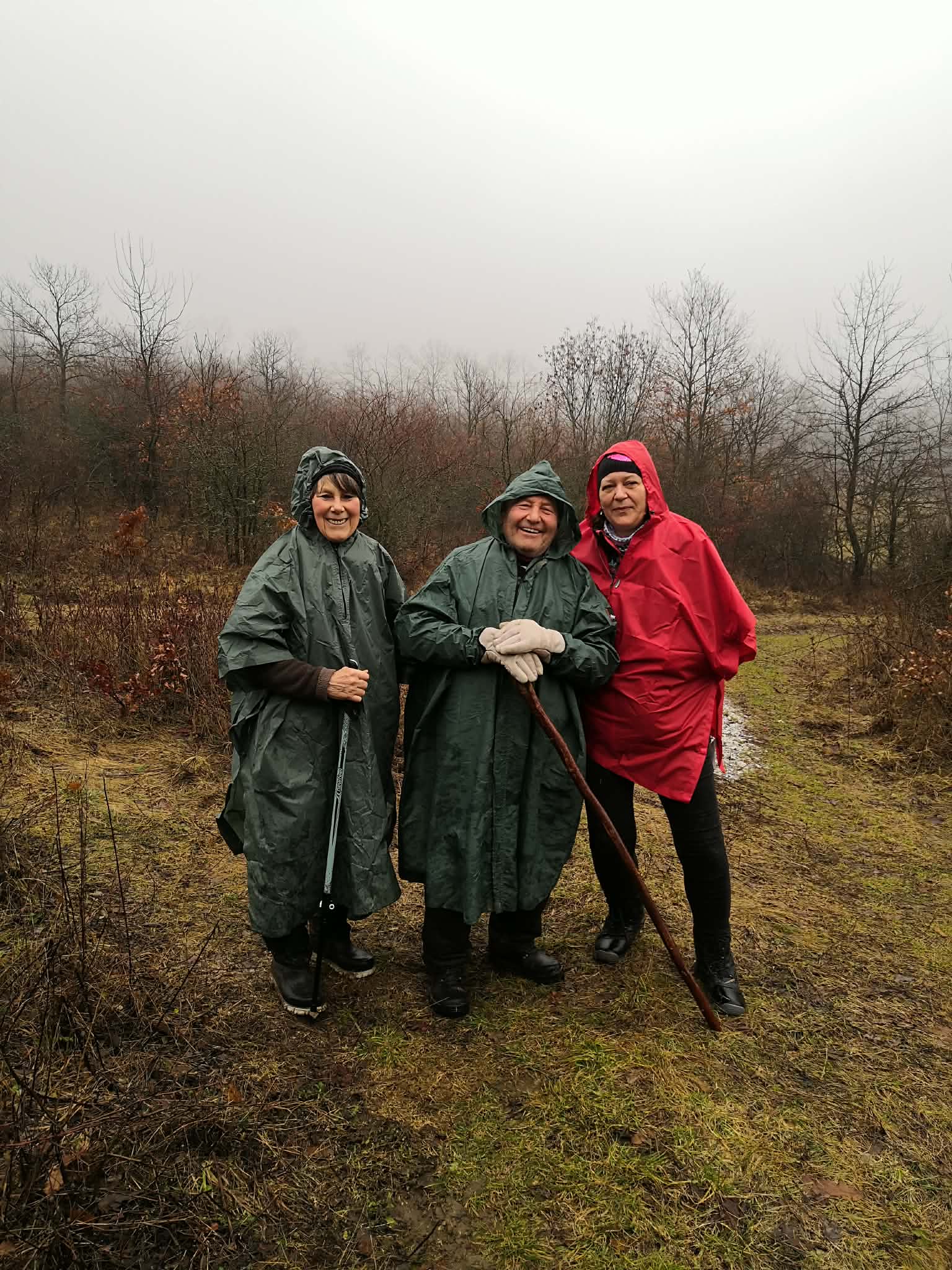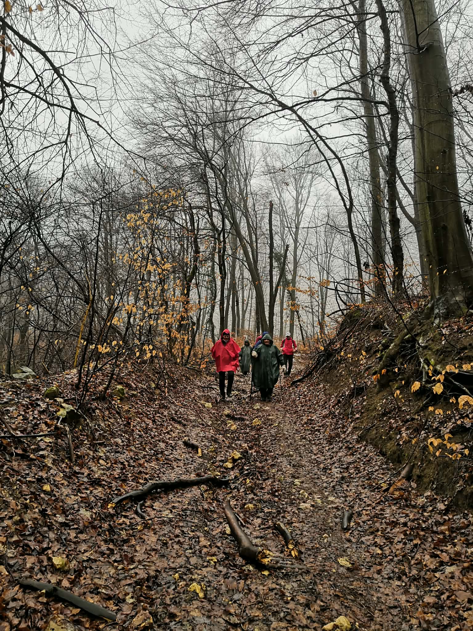Klastrompuszta előtt előkerültek az esőkabátok amik elijesztették az esőt, csak a folyamatos áztató szemerkélés miatt volt szükség, hogy végig rajtunk maradjon. Hivatalos ebédidőre a Pilisnyeregben harangozott a túravezető. Jól esett az elemózsia és utána a hátizsákból szintén előkerülő házi forraltbor. Pilisszentléleken a " Teca " gondűzőben még rásegítettünk az emésztésünkre, aztán az utolsó szakasznak is nekivágtunk. A terep itt volt a legnehezebb. Esztergomba érkezve Gabi és Kálmán kiosztotta az Okleveleket. Pesti vendégünket Juditot feltettük a Budapestre induló vonatra.